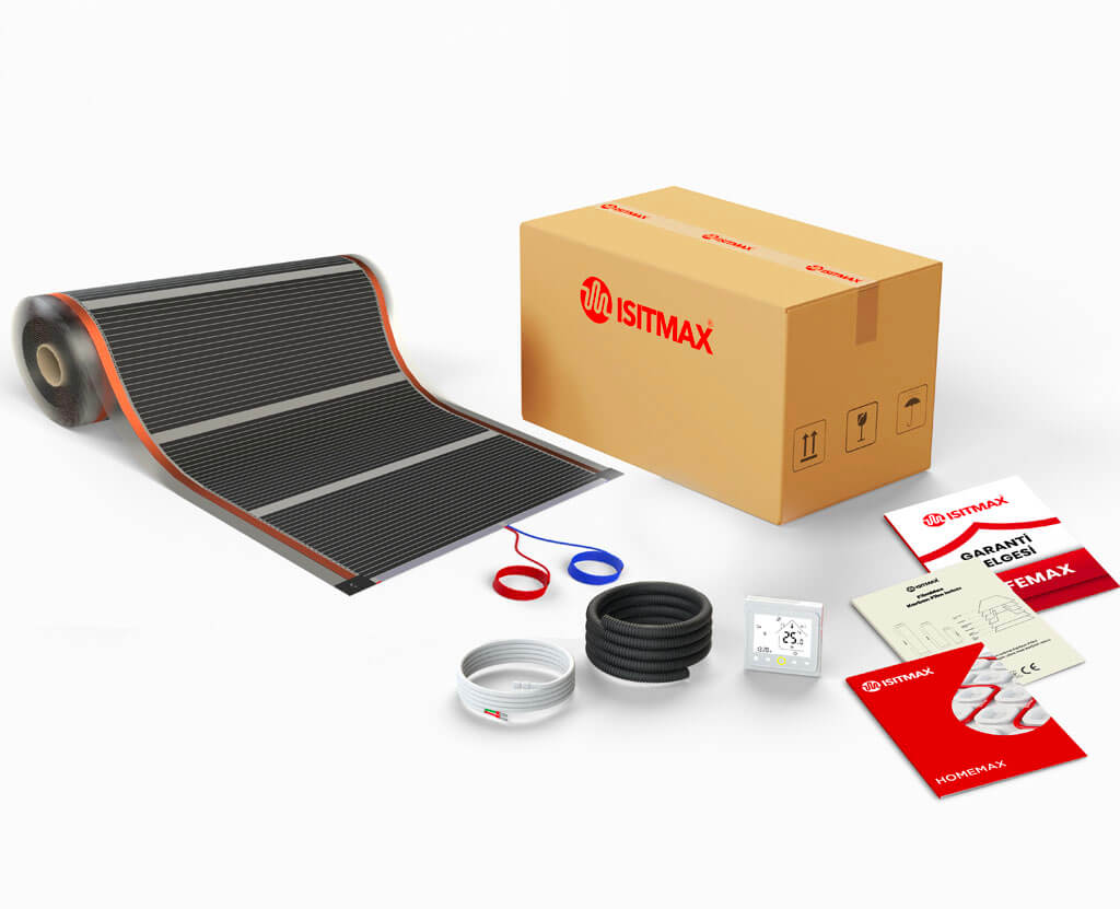 Yerden ısıtma sisteminiz kolay uygulanır. Sipariş verdiğiniz ürünümüz sizlere içinde seçtiğiniz ebatta fabrikasyon soğuk uç ile birlikte karbon ısıtıcı film, dijital dokunmatik ekranlı flouron marka termostat, bağlantı aparatları, kurulum klavuzu ve garanti belgesi ile birlikte gönderilir.